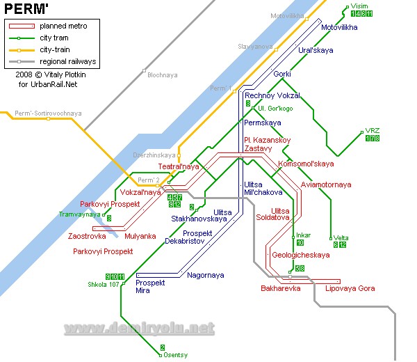 Rusya – Perm Tramvay Hattı ve Güzergah HaritasıPerm (Rusça: Пермь, eskiden (1940-57) Molotov), Rusya Federasyonu’nun batısında, Perm Krayı’nda kent. Kama Nehrinin her iki yakasına yayılmış durumdadır.